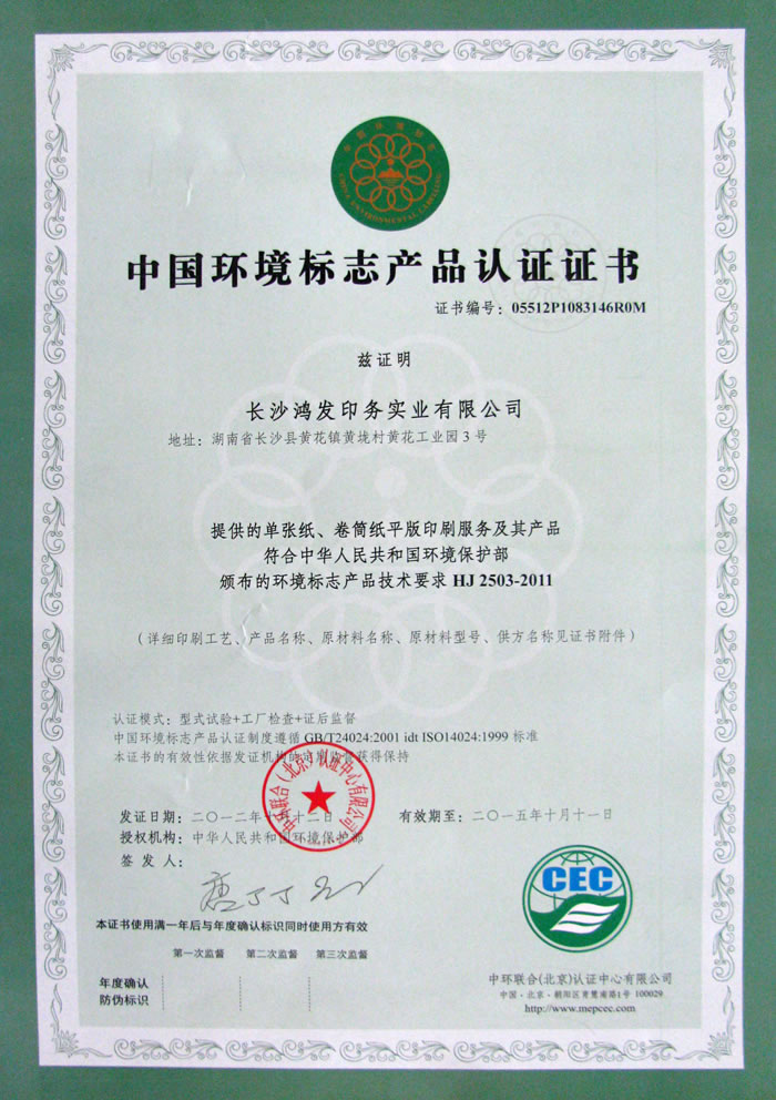中國環(huán)境標志產(chǎn)品認證證書(shū)